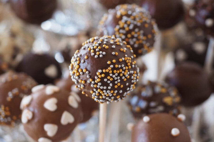 Pastelitos rellenos de bizcocho en forma de chupa-chups. Decoración personalizada. Disponibles a partir de 12 Uds.