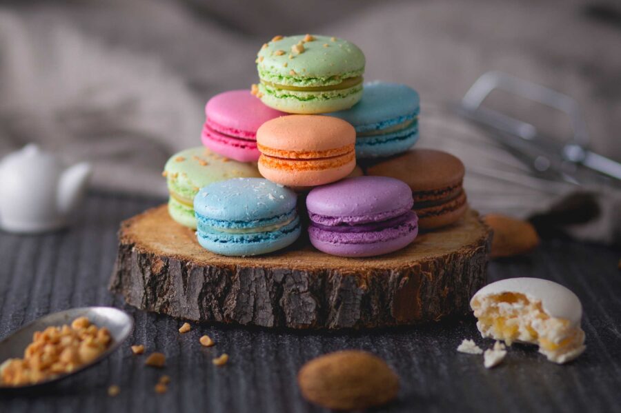 Galletas de origen francés, hechas con merengue vegano, harina de almendra y azúcar. Distintos colores y rellenos. A partir de 24 Uds.