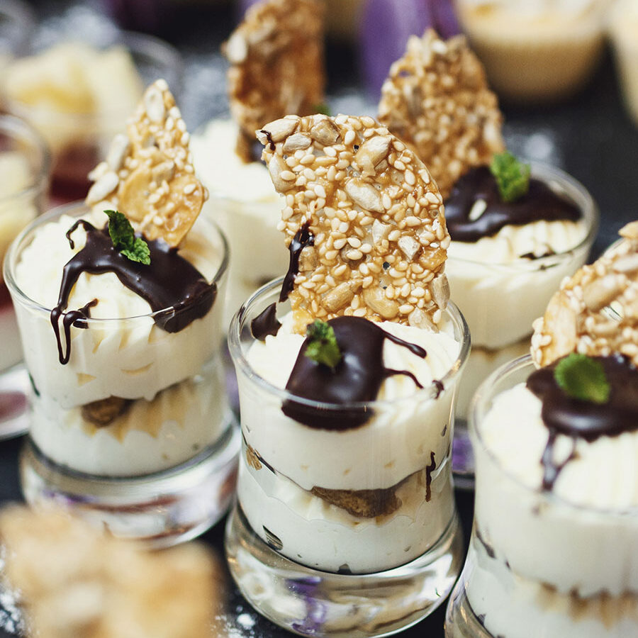 Postres presentados en vasitos o copas , como mousses, chocolates, cremas frías, tiramisú…etc., al gusto del cliente. Disponibles a partir de 12 Uds.